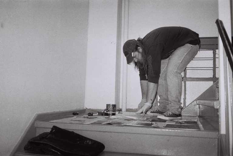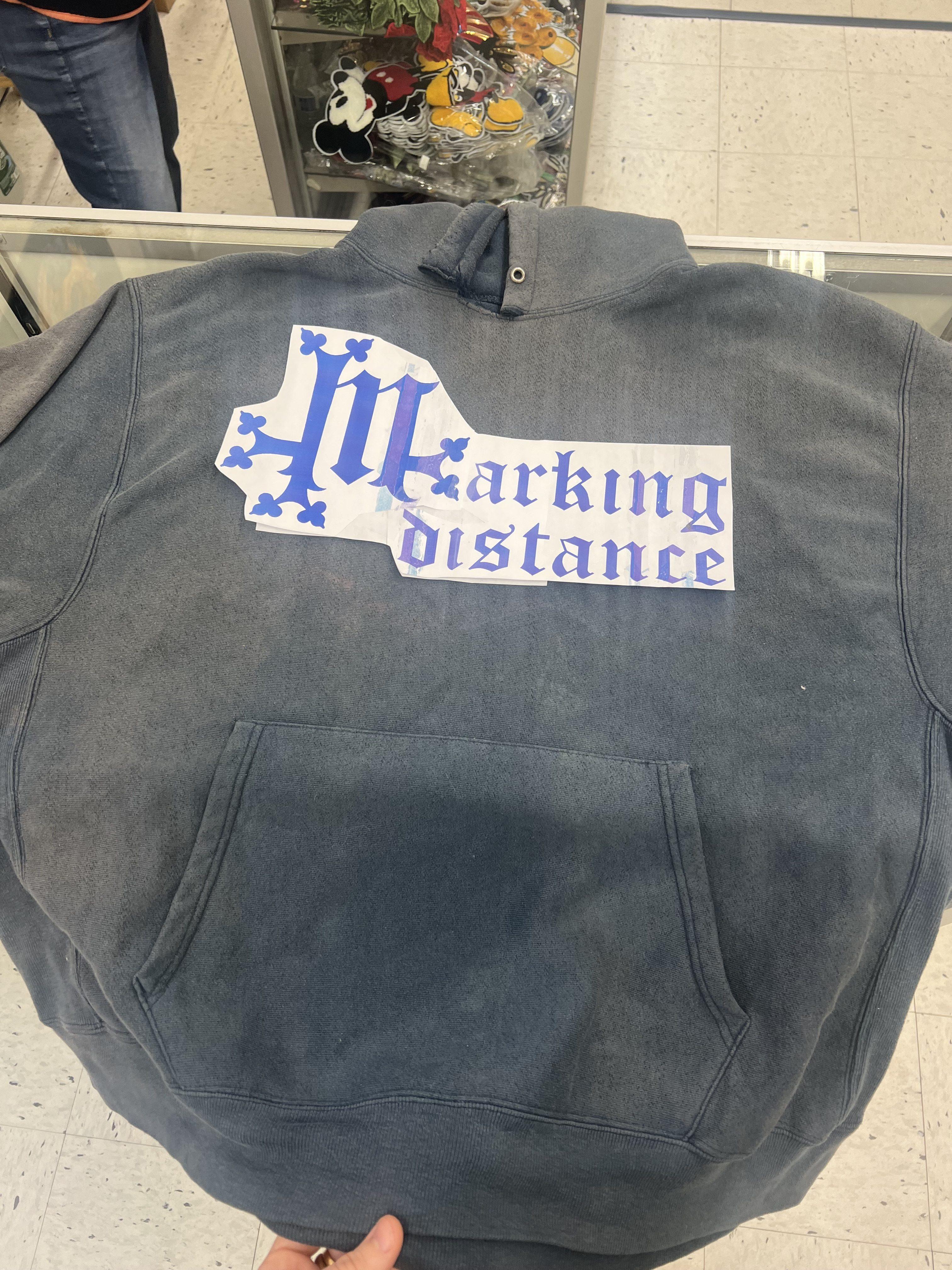 The logo hoodie was a vintage hoodie we found that was grey at first, then dyed blue by james and left in solution of vinegar, acid, and other things we dont want to tell you yet ;) for a few weeks which corroded the fabric and starting disintegrating it. Once taken out of the solution, we left in on the roof for a few months during the fall and let the sun, the rain and the weather wear it down.
