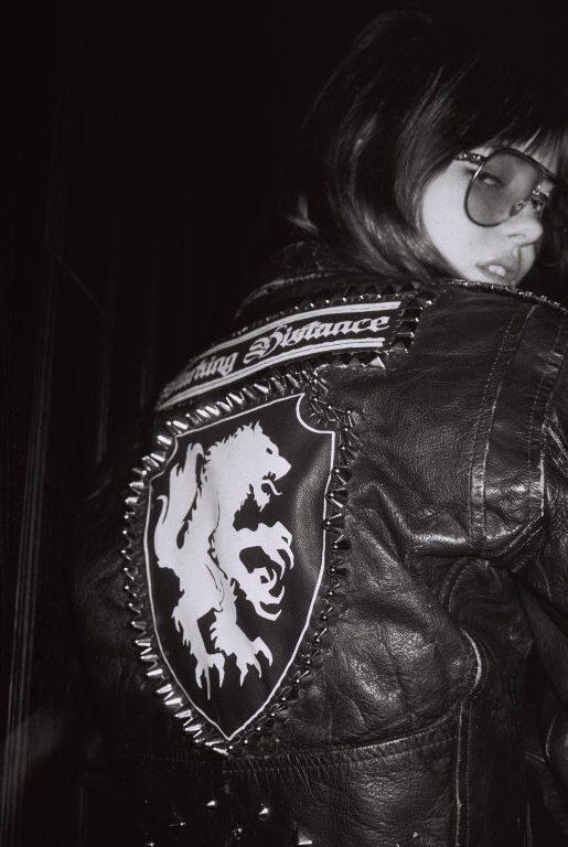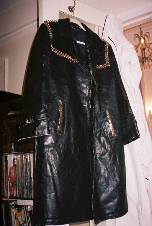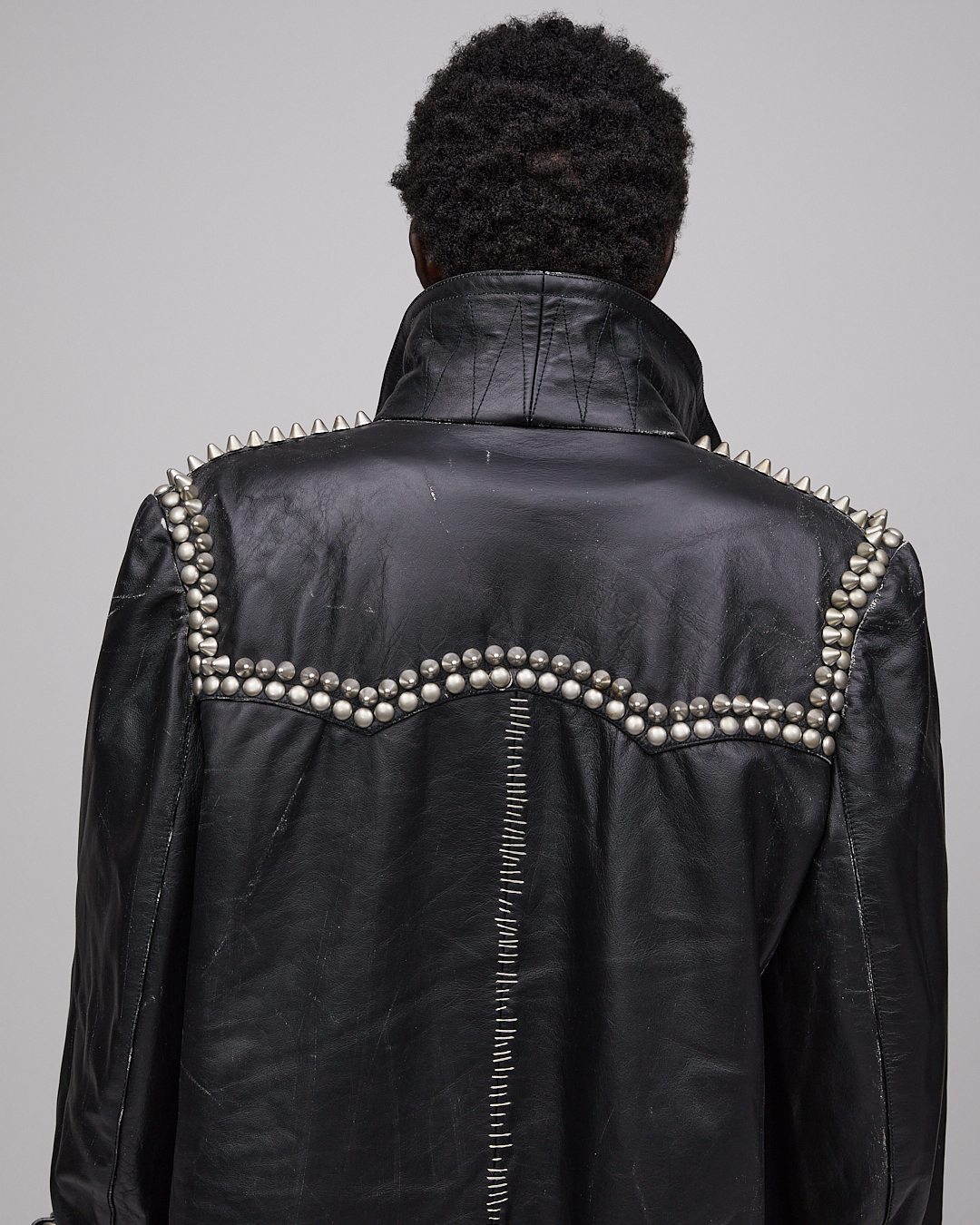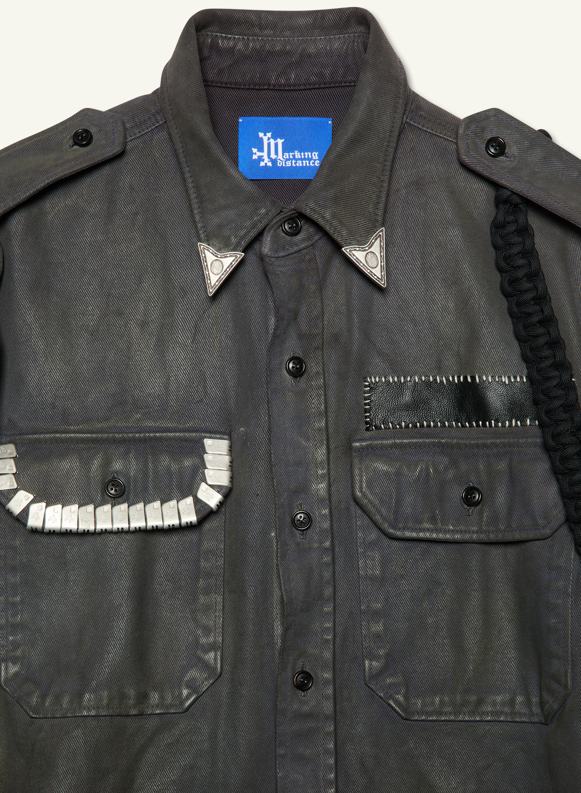 We then replaced where the police badge used to go and put tongue and nipple piercings in where the holes were. hand stitched a black leather name patch where you're supposed to write your own name in white out, replaced the missing buttons with spikes and added our signature lighter clips caps on the collar.