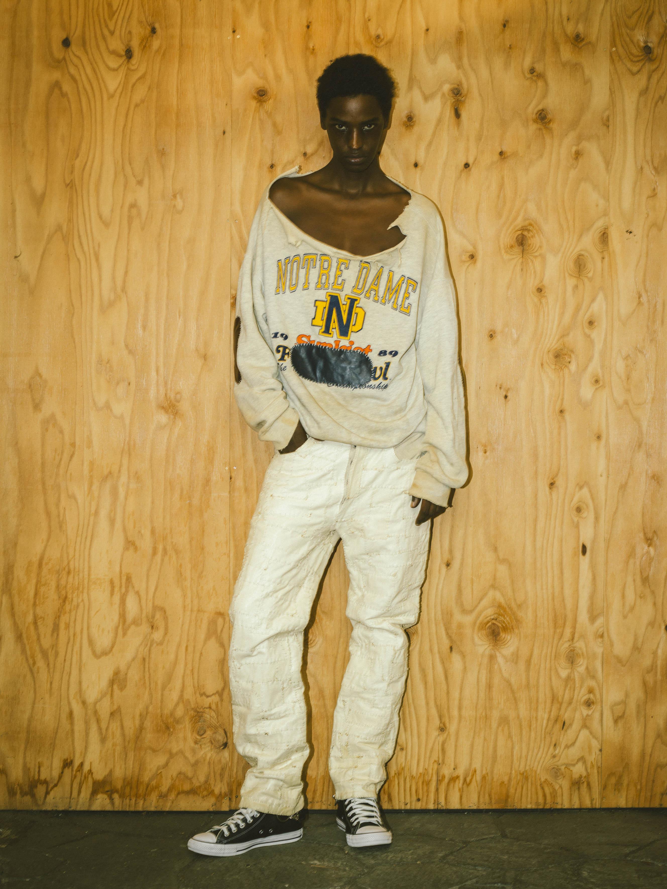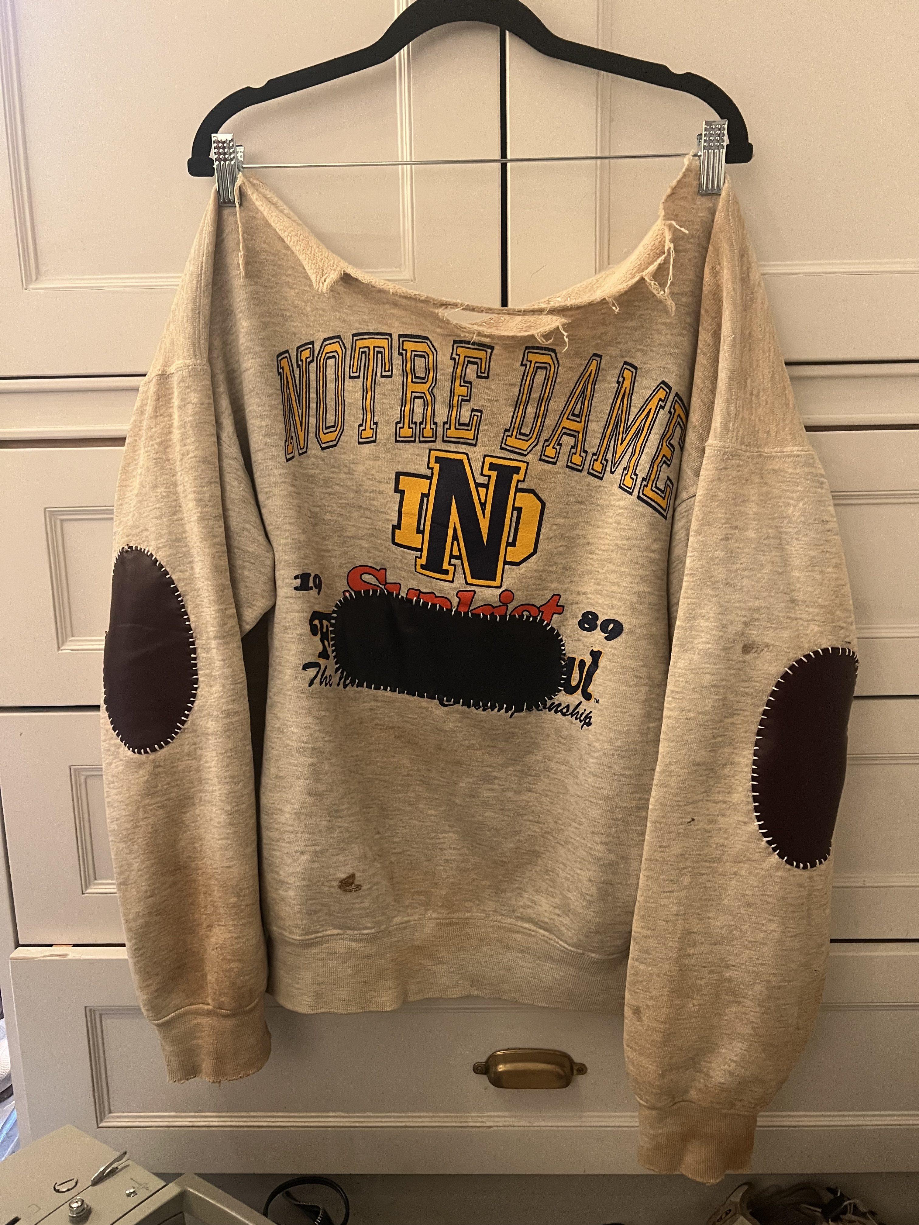 The original prototype of the notre dame crewneck was an old collegiate sweater we found from notre dame with a massive sunkist ad on it. We wanted to cover the ad by putting a leather patch on it which was handsewn with dental floss, and then i remembered all those margiela sweaters with the elbow patches which then inspired these elbow patches