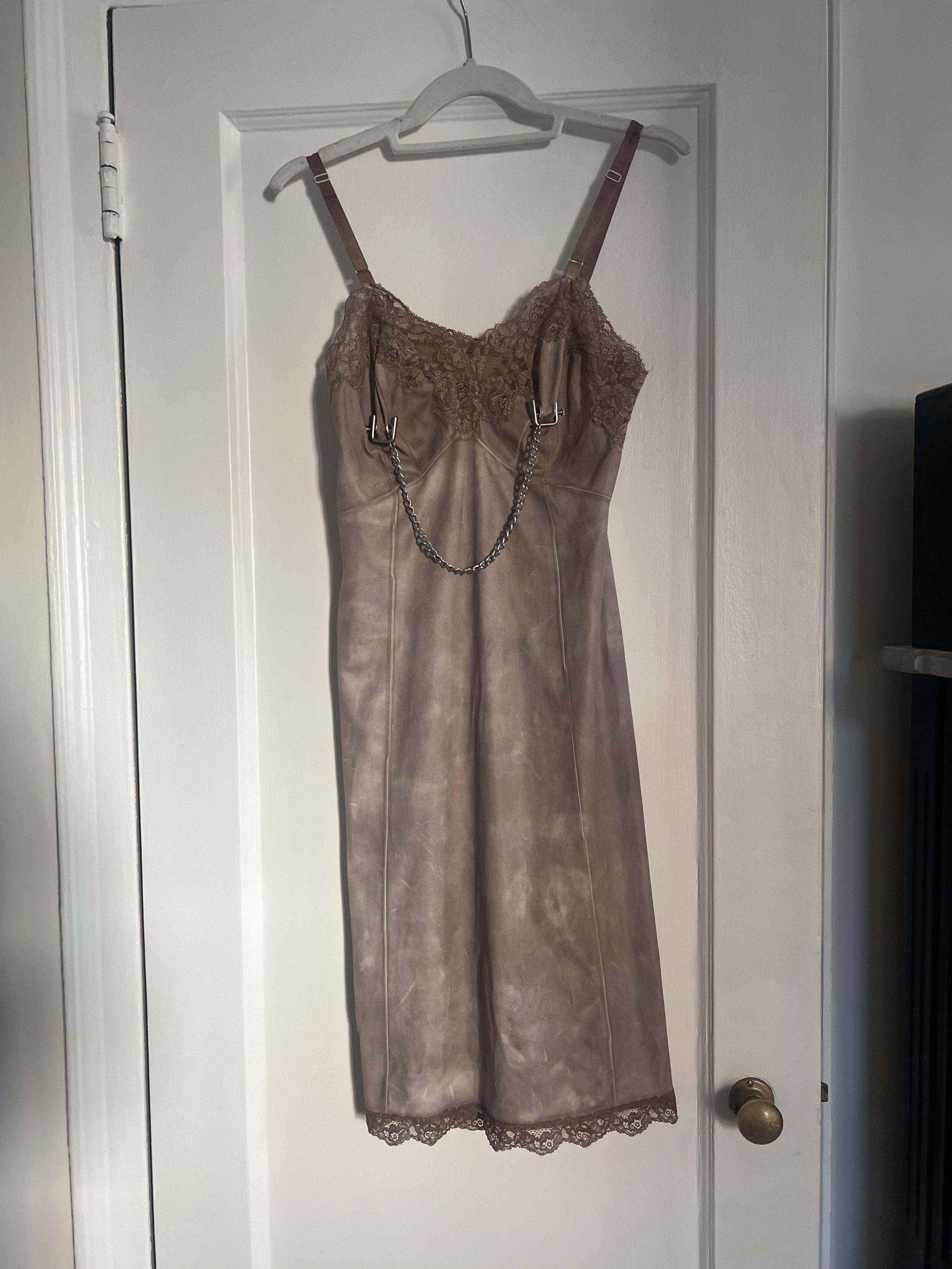 This was the fetish dress after the first few rounds of waxing, dying and bleaching. the wax gave it this almost leather like look to it, which happened on accident of course, but it was all part of the experiment.